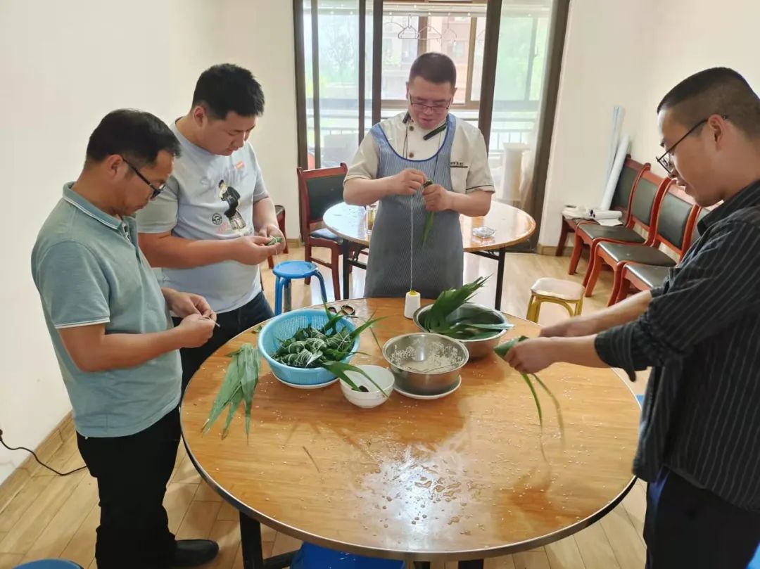 活動前期,職工食堂準備了所需食材,大家紛紛拿出看家本領,捋粽葉、填糯米、封口、扎捆,巧手翻飛。技術(shù)嫻熟的“老手”給“新手”示范,“新手”認真臨摹,忙得不亦樂乎,現(xiàn)場洋溢著濃濃的節(jié)日氣氛。不一會兒,?正方形、長條形、三角形,各式各樣形態(tài)可人,還有專屬定制“DIY”的粽子陸續(xù)誕生!