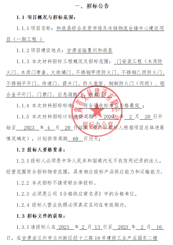 和政縣綜合農(nóng)貿市場及冷鏈物流倉儲中心建設項目(一期工程 )材料招標