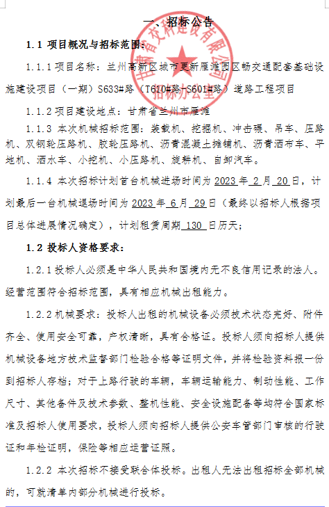蘭州高新區(qū)城市更新雁灘園區(qū)暢交通配套基礎(chǔ)設(shè)施建設(shè)項(xiàng)目(一期)S633#路(T610#路-S601#路)道路工程項(xiàng)目機(jī)械租賃招標(biāo)公告