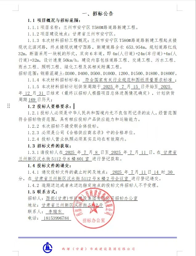 蘭州安寧區(qū)T580#路道路新建工程—材料招標(biāo)