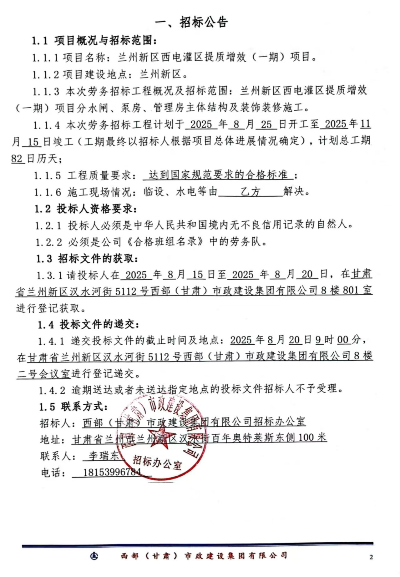 蘭州新區(qū)西電灌區(qū)提質增效(一期)項-勞務分包-招標公告