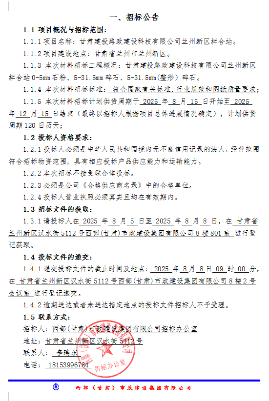甘肅建投路政建設(shè)科技有限公司蘭州新區(qū)拌合站-材料招標公告