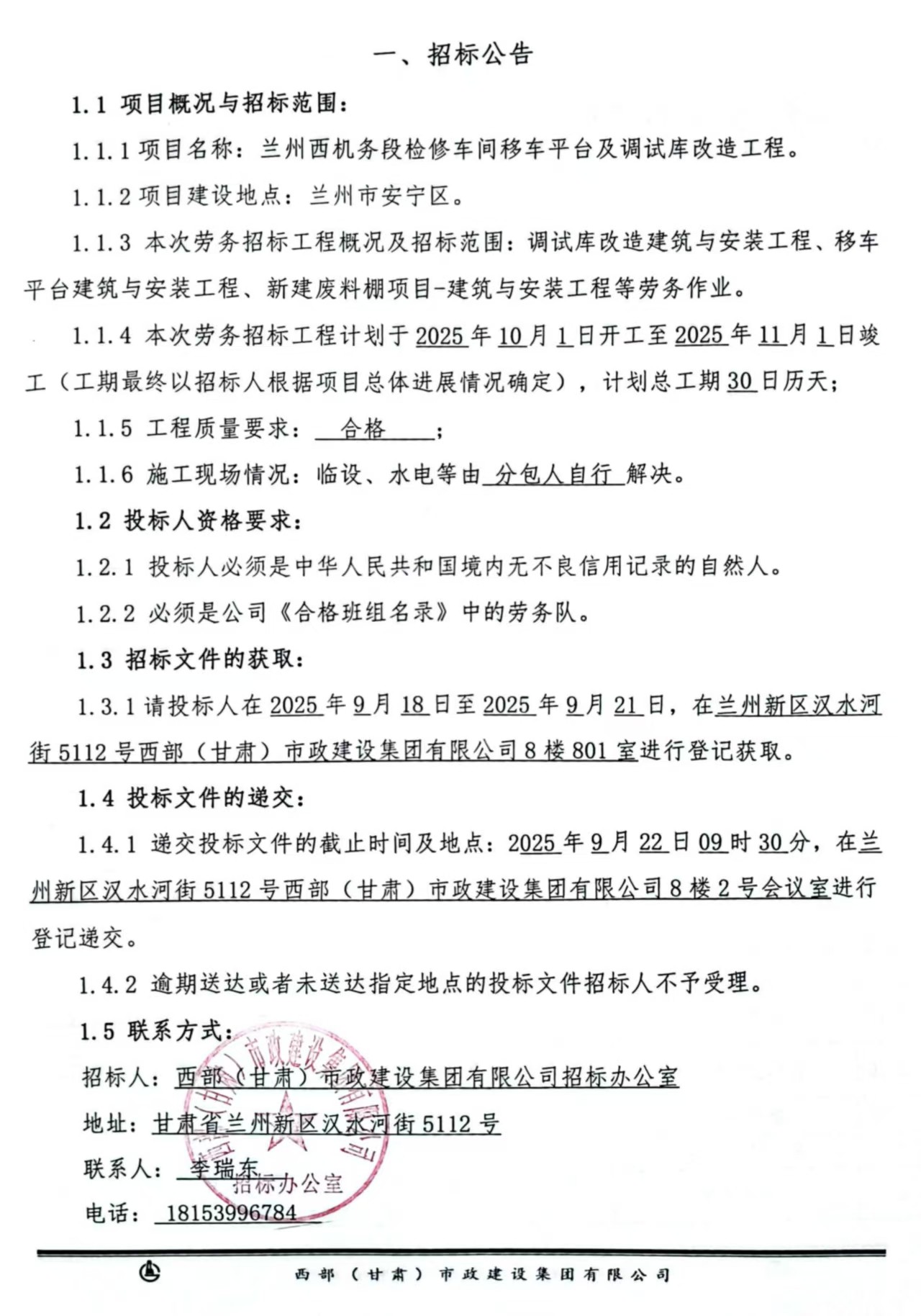 蘭州西機(jī)務(wù)段檢修車間移車平臺及調(diào)試庫改造工程-勞務(wù)分包招標(biāo)公告